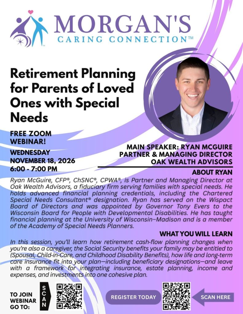 This educational webinar is presented by Ryan McGuire, CFP®, ChSNC®, CPWA®, Partner and Managing Director at Oak Wealth Advisors, a fiduciary firm that specializes in financial planning for families with special needs.